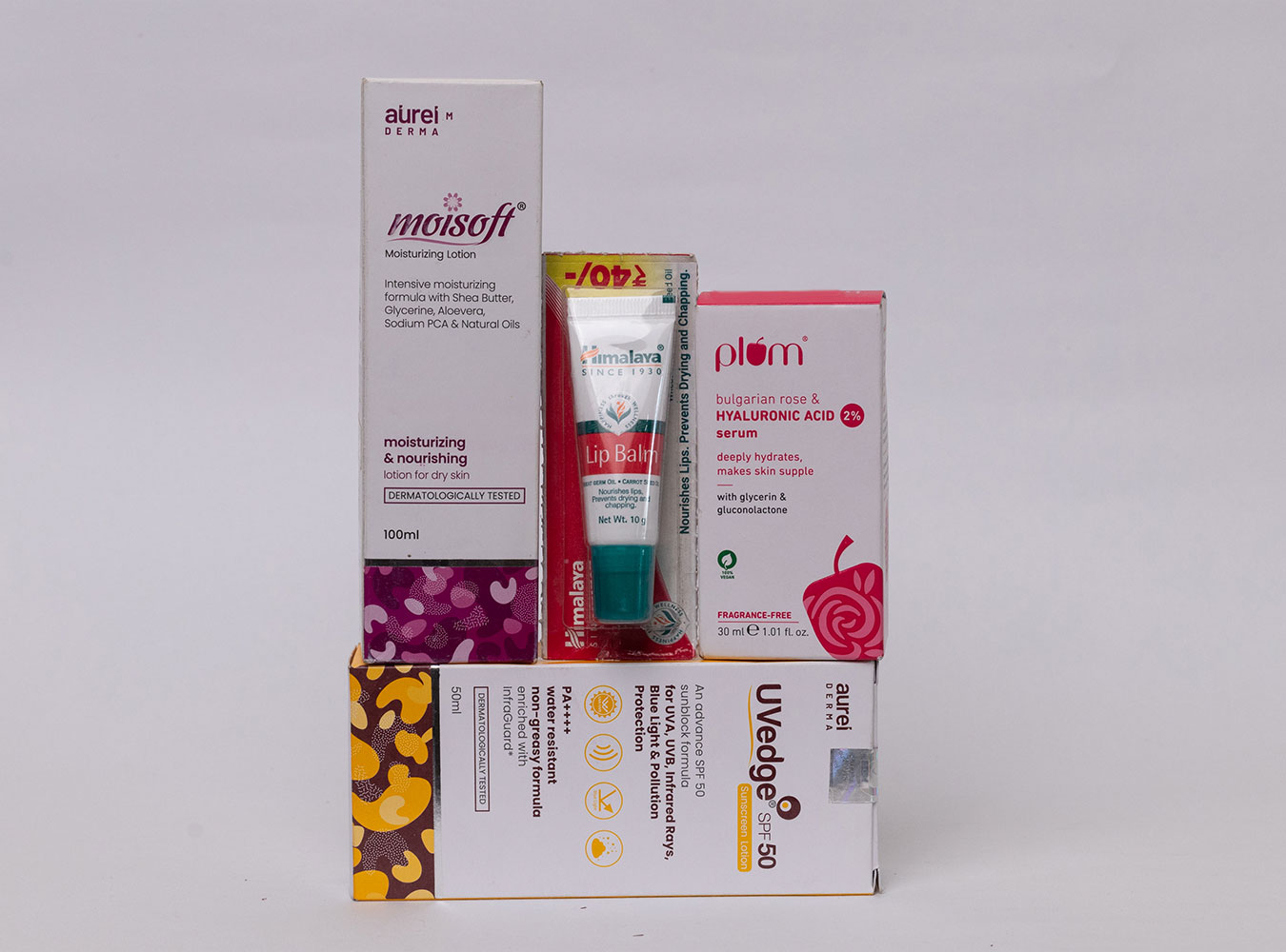 Moisoft Loation, Himalaya Lip Balm, UVedge Sunscreen, Plum Serum