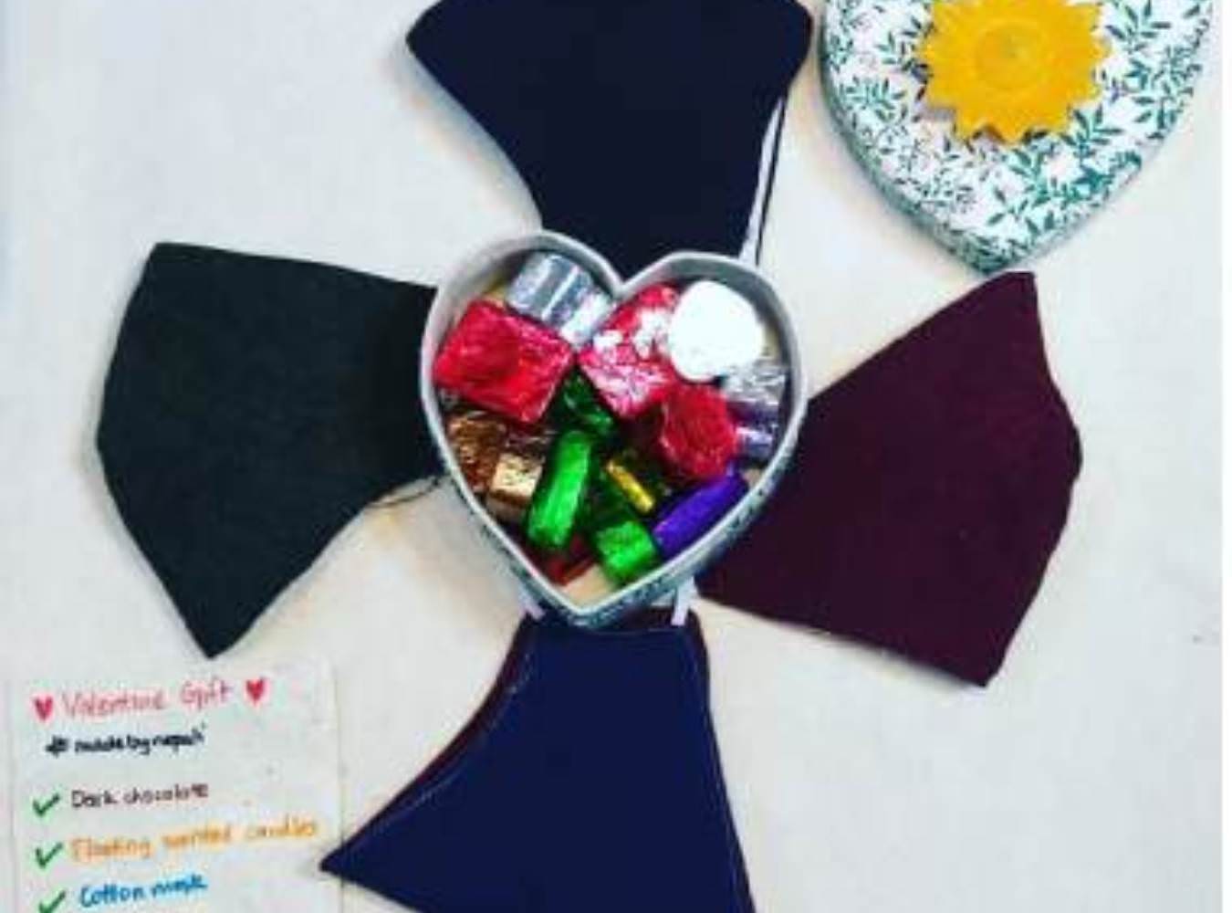 A Valentine's Day themed gift set featuring multiple reusable cloth face masks in various colors (black, navy blue, maroon/burgundy) arranged around a decorative heart-shaped container. The set includes wrapped chocolates in the heart box and comes with a product feature card.